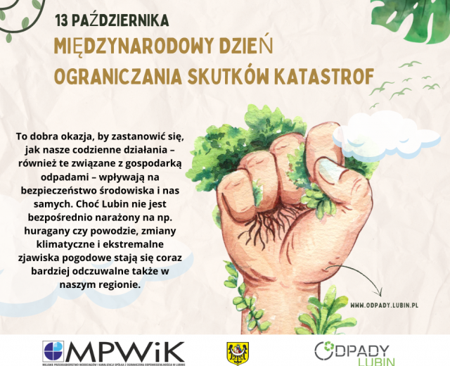13 października – Międzynarodowy Dzień Ograniczania Skutków Katastrof 13-10-2025 08:45 13 października obchodzimy Międzynarodowy Dzień Ograniczania Skutków Katastrof. To święto ma za zadanie zwiększenie świadomości na temat katastrof naturalnych (jak trzęsienia ziemi, powodzie, huragany) oraz promowanie działań, które pomagają zmniejszyć ich wpływ. To dobra okazja, by zastanowić się, jak nasze codzienne działania – również te związane z gospodarką odpadami – wpływają na bezpieczeństwo środowiska i nas samych. Choć Lubin nie jest bezpośrednio narażony na np. huragany czy powodzie, zmiany klima Odpady a klęski żywiołowe – czy to ma związek? Tak! Niewłaściwe gospodarowanie odpadami przyczynia się do degradacji środowiska, zanieczyszczenia wód, gleby i powietrza. W rezultacie osłabia to naturalne bariery ochronne, zwiększając podatność regionu na skutki zmian klimatu, takie jak: intensywne opady deszczu i lokalne podtopienia, fale upałów, zanieczyszczenie wód gruntowych, erozja gleb. Dodatkowo, rosnące hałdy odpadów czy niewłaściwie składowane śmieci mogą stanowić zagrożenie w razie gwałtownych zjawisk atmosferycznych – np. zatkanie kanalizacji podczas ulew czy rozprzestrzenianie się toksycznych substancji. Jak mieszkańcy Lubina mogą działać lokalnie, by chronić globalnie? Każdy z nas ma realny wpływ na stan środowiska. Oto kilka prostych działań, które mogą zmniejszyć ryzyko związane z klęskami żywiołowymi i poprawić jakość życia w Lubinie: Segreguj odpady – prawidłowa segregacja zmniejsza ilość odpadów trafiających na składowiska, a tym samym ogranicza emisję gazów cieplarnianych. Oddawaj odpady niebezpieczne we właściwe miejsca – zużyte baterie, chemikalia czy elektrośmieci nie powinny trafiać do zwykłego kosza. Sprawdź harmonogram zbiórek w Lubinie www.odpady.lubin.pl lub skorzystaj z PSZOK-u. Oszczędzaj zasoby – kupuj rozsądnie, wybieraj produkty z recyklingu, ogranicz zużycie plastiku. Im mniej śmieci produkujemy, tym mniej problemów z ich utylizacją. Zgłaszaj dzikie wysypiska – nielegalne składowiska to zagrożenie dla środowiska i zdrowia mieszkańców. Reaguj – zgłoś problem do Urzędu Miasta lub odpowiednich służb. Bądź odpowiedzialny podczas ekstremalnych zjawisk pogodowych – zabezpieczaj odpady, by nie zostały porwane przez wiatr czy wodę i nie zaszkodziły otoczeniu. Lubin stawia na zrównoważony rozwój Warto podkreślić, że Lubin podejmuje coraz więcej działań proekologicznych: edukacyjne kampanie odpadowe, rozwój systemu selektywnej zbiórki odpadów, nowe inwestycje w zieloną infrastrukturę. Jednak prawdziwa zmiana zaczyna się od postaw mieszkańców. 13 października – czas na refleksję i działanie Międzynarodowy Międzynarodowy Dzień Ograniczania Skutków Katastrof to nie tylko data w kalendarzu. To przypomnienie, że odpowiedzialne gospodarowanie zasobami i odpadami to nie tylko ekologiczny wybór, ale i element budowania bezpiecznej, odpornej na kryzysy lokalnej społeczności. Lubinianie, pokażmy, że zależy nam na przyszłości naszego miasta – zacznijmy od siebie i swojego kosza na śmieci!