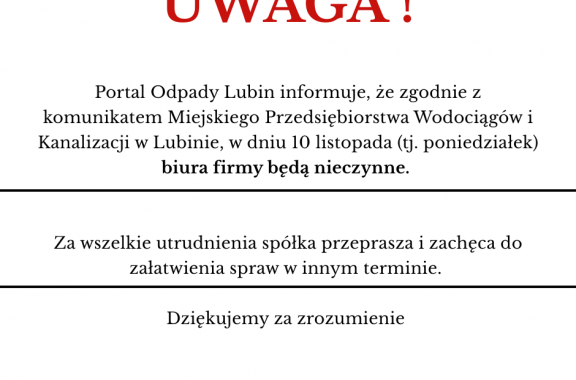 24 i 31 grudnia 2022r. Punkt Selektywnej Zbiórki Odpadów Komunalnych będzie nieczynny. 20-12-2022 10:00 Informujemy, że w dniu 24 i 31 grudnia 2022r. Punkt Selektywnej Zbiórki Odpadów Komunalnych w Lubinie będzie zamknięty.
