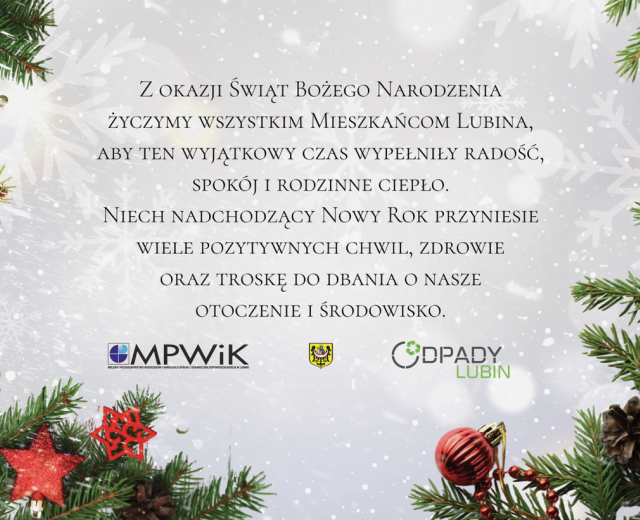 Drodzy Mieszkańcy Lubina, 23-12-2025 01:01 z okazji Świąt Bożego Narodzenia życzymy Państwu spokoju, radości oraz czasu pełnego ciepła spędzonego w gronie najbliższych. Niech nadchodzący Nowy Rok przyniesie zdrowie, pomyślność i dobre zmiany – także te sprzyjające naszej wspólnej trosce o środowisko. Dziękujemy za odpowiedzialne podejście do segregacji odpadów i codzienne dbanie o czystość naszego miasta.