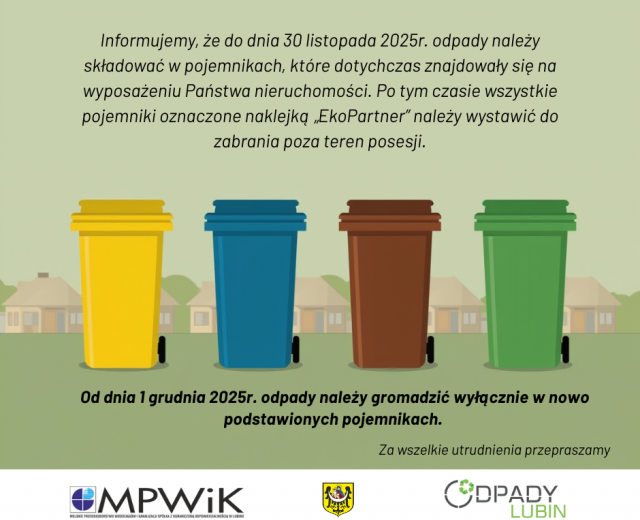 Szanowni Mieszkańcy! 13-11-2025 02:08 Informujemy, iż w związku ze zmianą Operatora odbierającego odpady komunalne z nieruchomości objętych gminnym systemem gospodarowania odpadami od dnia 14.11.2025r. będą podstawiane nowe pojemniki do gromadzenia odpadów. W związku z powyższym informujemy, że do dnia 30 listopada 2025r. odpady należy składować w pojemnikach, które dotychczas znajdowały się na wyposażeniu Państwa nieruchomości. Po tym czasie wszystkie pojemniki oznaczone naklejką „EkoPartner” należy wystawić do zabrania poza teren posesji. Od dnia 1 grudnia 2025r. odpady należy gromadzić wyłącznie w nowo podstawionych pojemnikach. W okresie przejściowym mogą pojawić się niedogodności związane z posiadaniem dwóch kompletów pojemników. Nie ma konieczności ponownego deklarowania zapotrzebowania na pojemniki. Za wszelkie utrudnienia przepraszamy i prosimy o współpracę.